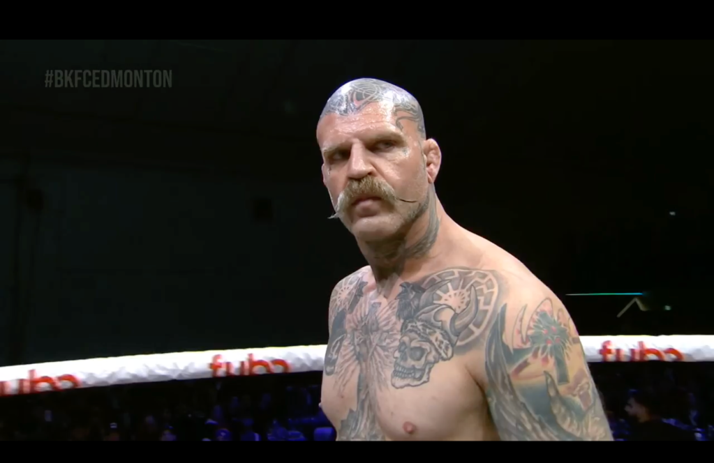 One of the winners was debuting Montana-based fighter Sam Polk. Listed at 6′ 2” and 205 pounds, the 42-year-old Polk, who goes by the nickname “Blunt Force Trauma,” squared up against the equally heavily tattooed and mustachioed opponent, Jake Craig. After walking out to a ballroom-style crowd and stepping into BKFC’s circular ring, Polk and Craig toed the line, beginning their five-round scrap.