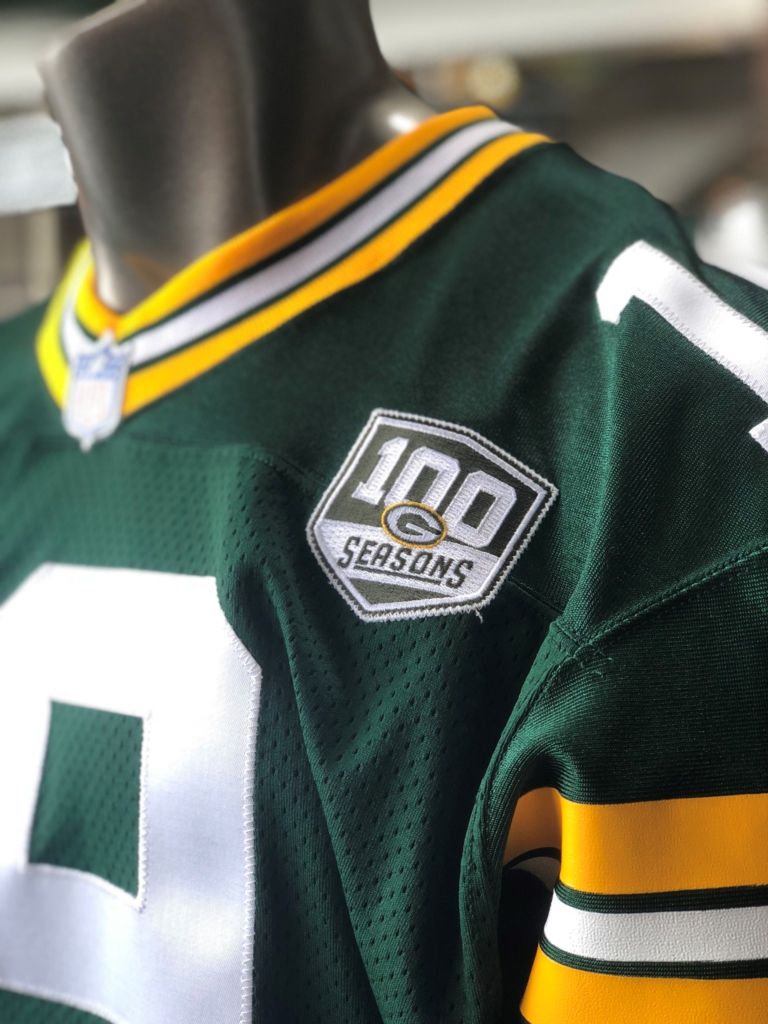 100 Seasons patch on a Green Bay Packers jersey–photo via Green Bay Packers