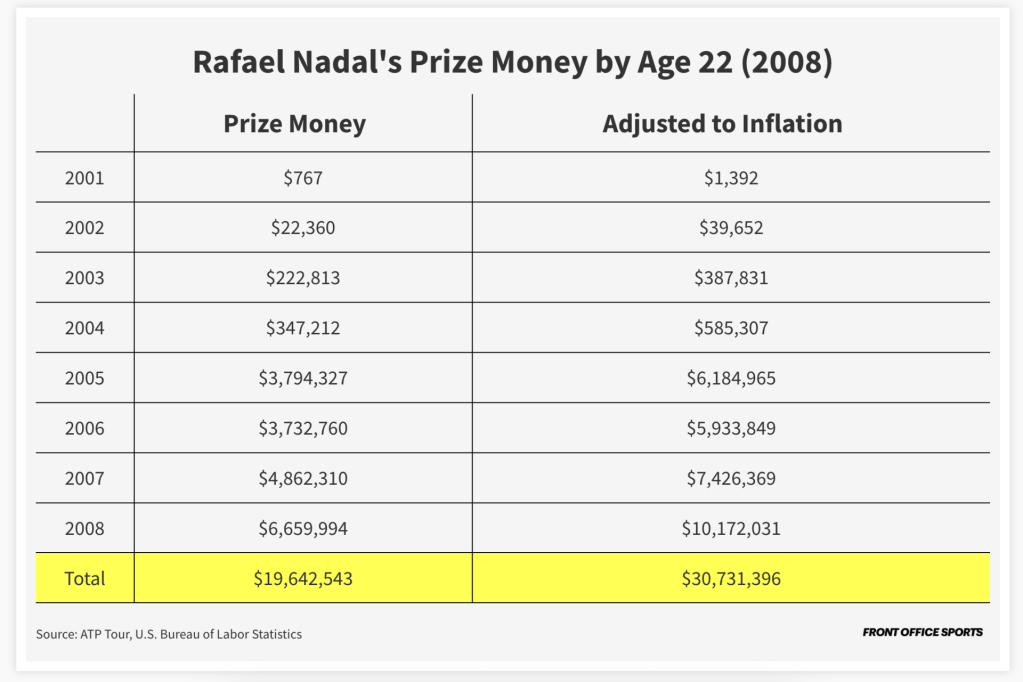 By the end of 2008, when Nadal was nearly 22 years and seven months old, he had secured $19.6 million. Inflation plays a factor when comparing career earnings, and Nadal’s number adjusted to inflation is about $30.7 million.