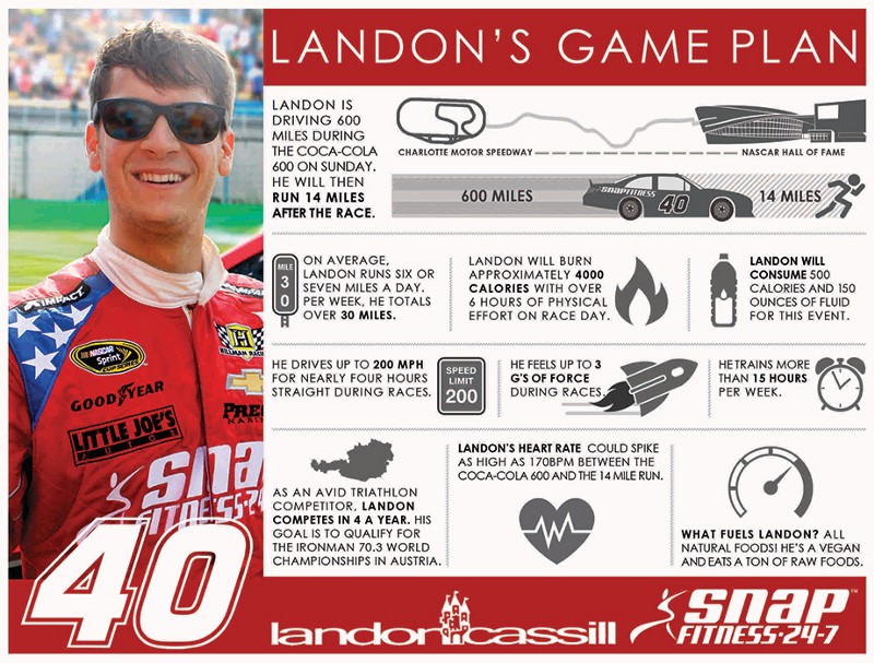 Two years ago, Landon Cassil, who fittingly was sponsored by Snap Fitness, completed the Coca-Cola 600 and ran 14 miles to the NASCAR Hall of Fame, immediately following the conclusion of the longest event on the NASCAR schedule. Cassill finished the 13.92 run in 1:41:19, which comes out to be a 7:19 minute mile on average. To make things tougher, he also competed in the 300-mile NASCAR XFINITY Series event that Saturday. 900 miles of racing and a 14-mile run after his second NASCAR event … not too shabby.