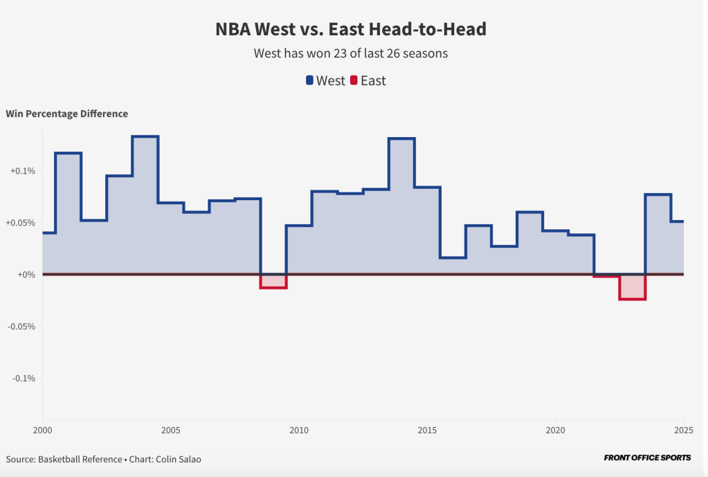 In that same time frame, a Western Conference team has won the NBA title 16 times to just 9 from the Eastern Conference.