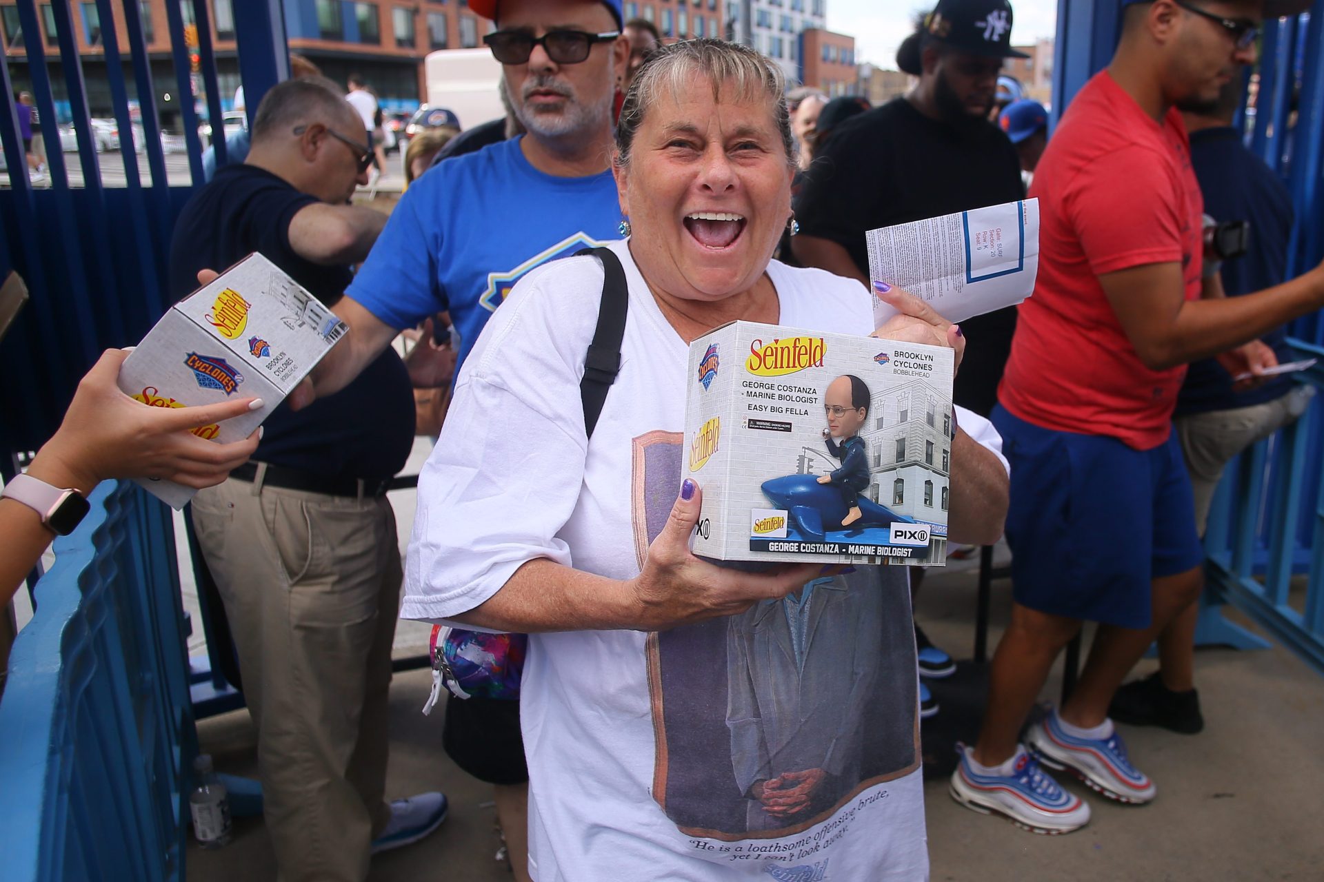 Near the end of the line, Mark Bigel is in good spirits. The New York native, in town from Los Angeles, showed up early with his wife to walk around the stadium, only to stumble into tonight. Having braved a couple of bobblehead days at Dodger Stadium, he knew what to expect. “Most of the time, when they hand something out, you look at it for a minute and throw it away,” he says. “But people keep bobbleheads.”