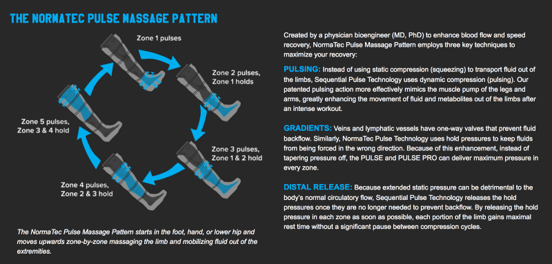 The “Pulse Pro” system rejuvenates muscle tissue and increases blood circulation, which helps athletes recover from pain and soreness at a faster pace. The system uses patented compression technology that mobilizes fluid and massages the limbs.