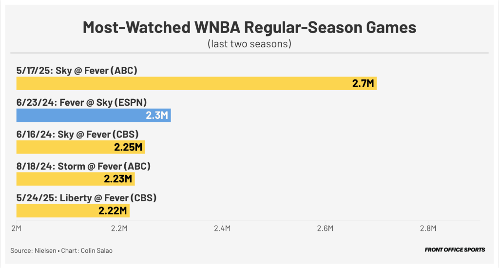 It was also the second-most-watched game of the WNBA season (which started May 16). The most-watched game was on opening weekend between the Fever and Sky, which drew 2.7 million viewers on ABC, the most-watched regular-season game ever on ESPN platforms. It was also the most-streamed WNBA game ever on Paramount+, though the exact viewership numbers on the service are unclear.