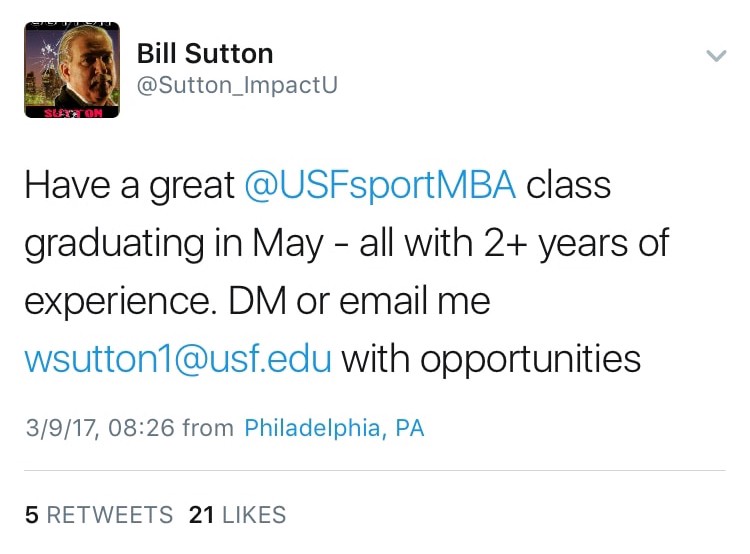 I was scrolling through Twitter and saw that Front Office Sports had retweeted a tweet from Bill Sutton, who is the Director of the University of South Florida’s Sport and Entertainment Management program. I soon found my way onto USF’s program website. Everything about it was the perfect fit: the dual degree aspect, residency program and 100 percent placement rate was exactly what I was looking for.