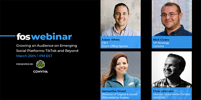 In this webinar Chris Littmann, Director of Social Media Content, NASCAR, Samantha Wood, Director of Digital & Social, Philadelphia Eagles, Nick Cicero, VP of Strategy, Conviva, join Adam White, CEO, Front Office Sports, to discuss their experience maximizing the impact of new platforms, including how they are growing an audience on TikTok.