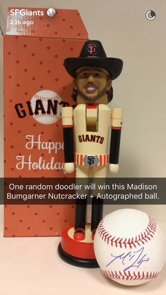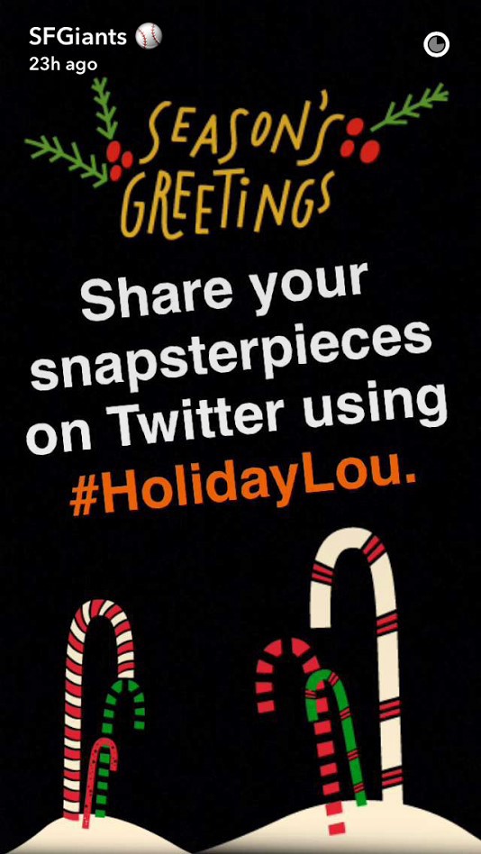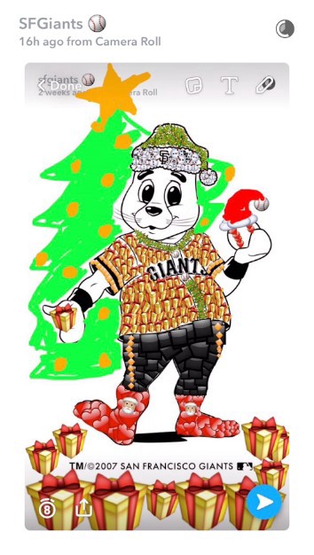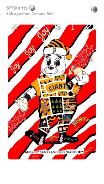 The Giants did a phenomenal job with this holiday promotion. Fans were encouraged to follow the team’s SnapChat account, screen shot the image of Lou Seal, and fill in the image with holiday-themed emojis. The fan with the best decorated #HolidayLou won a Madison Bumgarner Nutcracker and autographed ball. It’s a great way to engage fans during the off-season, especially during the holidays. Below are some of the participants with the eventual winner. All images via the San Francisco Giants SnapChat account.