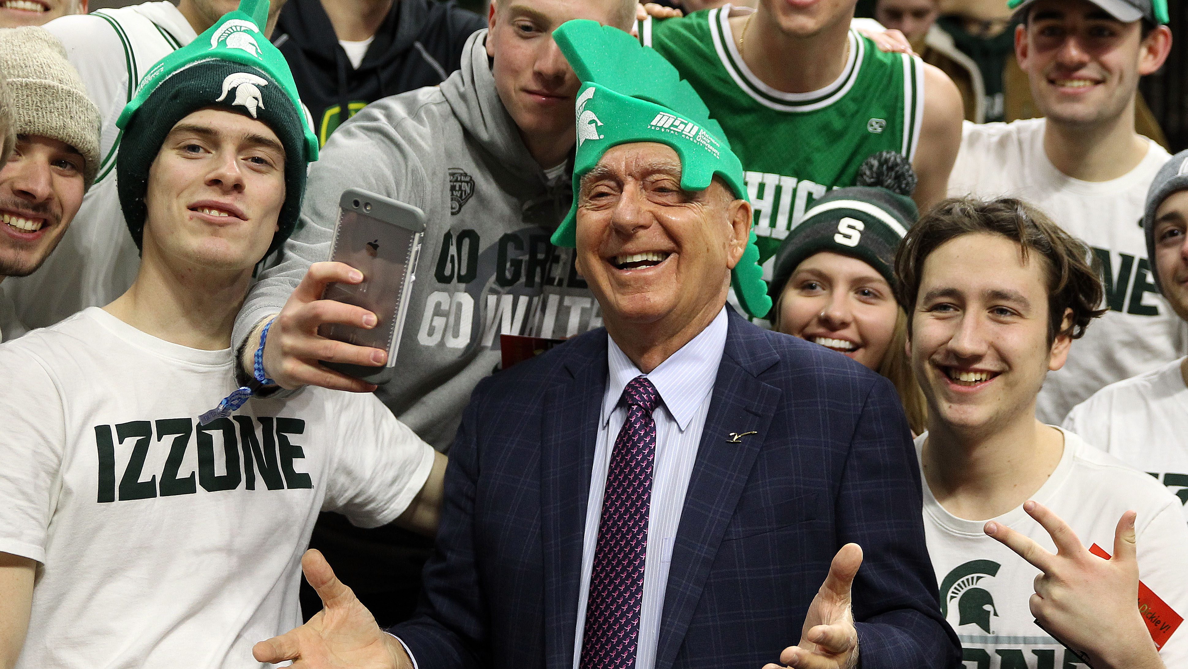 Feb 10, 2018; East Lansing, MI, USA; Michigan State Spartans student section hangs out with Dick Vitale prior to a game at the Jack Breslin Student Events Center. Mandatory Credit: Mike Carter-USA TODAY Sports