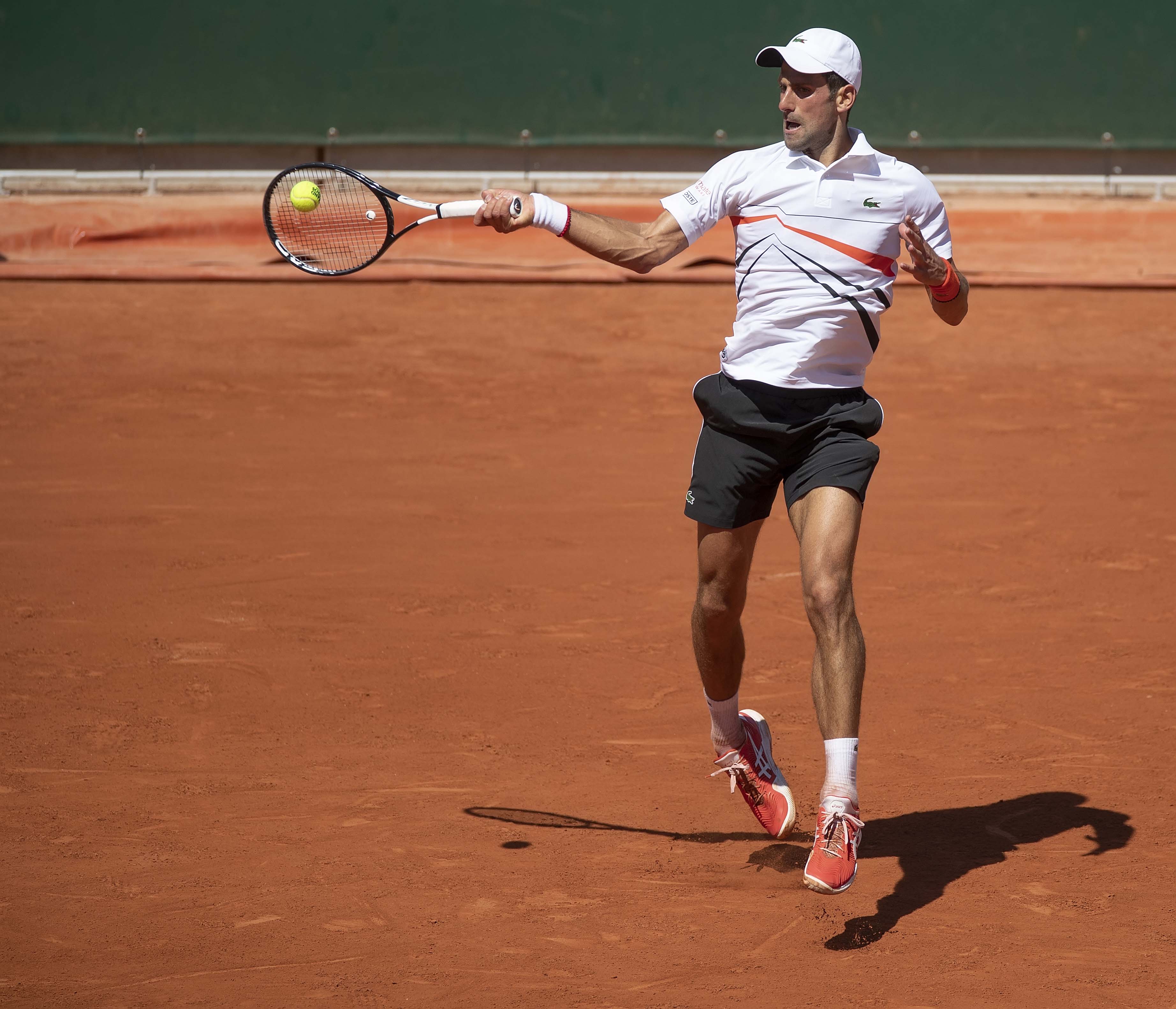 Jun 1, 2019; Paris, France: Novak Djokovic (SRB) in action during his match against Salvatore Caruso (ITA) on day seven of the 2019 French Open at Stade Roland Garros. Mandatory Credit: Susan Mullane-USA TODAY Sports