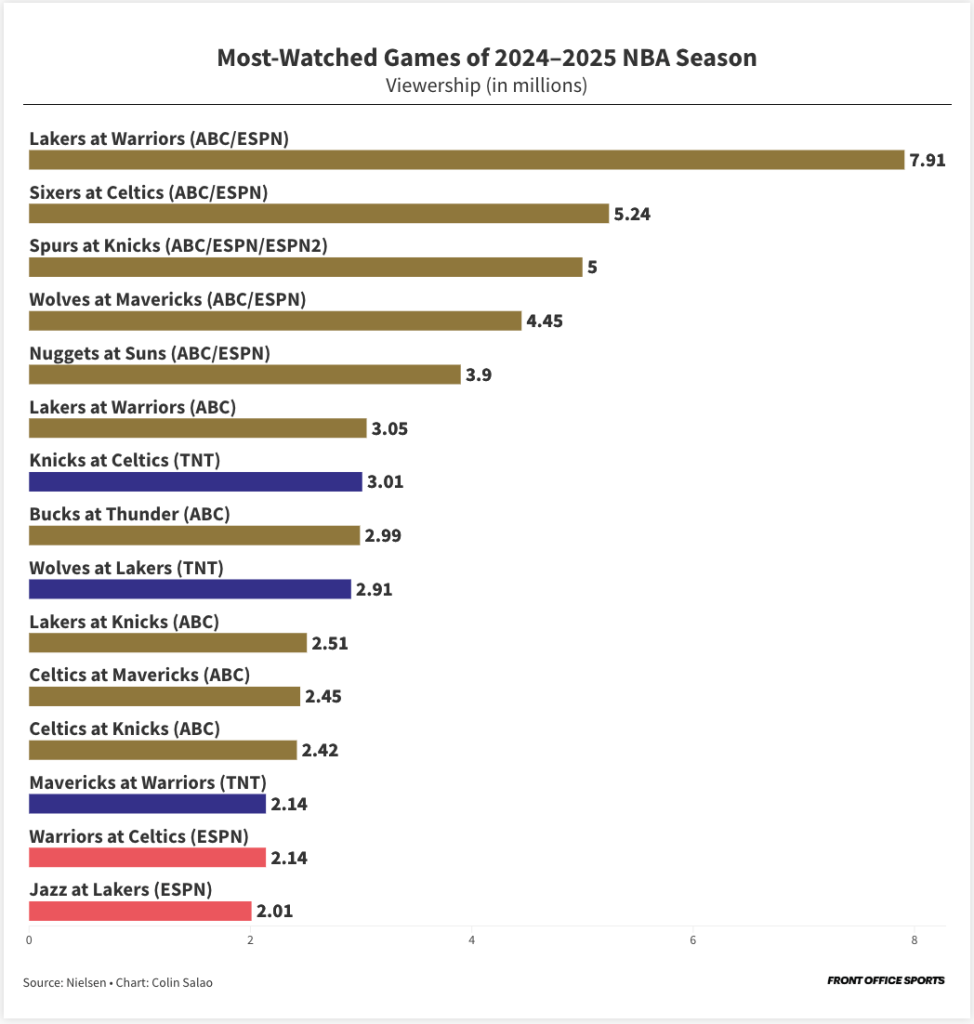 Its next-largest draws were games with a storyline entering the night: 2.1 million viewers on Nov. 12 for Mavericks guard Klay Thompson’s first game against the Warriors, his former team, and 1.9 million when the 15–0 Cavaliers battled the defending champion Celtics.