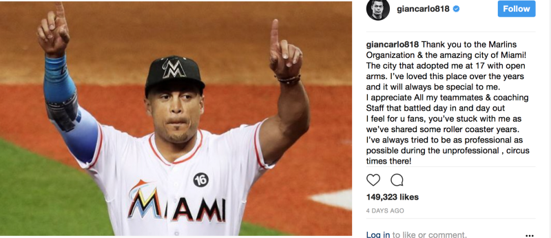 So far, the team has traded away Dee Gordon, Marcell Ozuna, and Giancarlo Stanton for what appears to be nothing but spare parts and salary relief. On top of that, they mishandled the trading of Stanton so epically that the outfielder turned to Instagram and Twitter to vent and say “good riddance!”