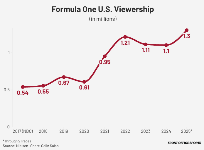 ESPN took over F1’s domestic broadcasting rights from NBC in 2018, and it was a beneficiary of the racing series’ popularity boom rooted in the success of Netflix’s docuseries Formula 1: Drive to Survive, which launched in March 2019.