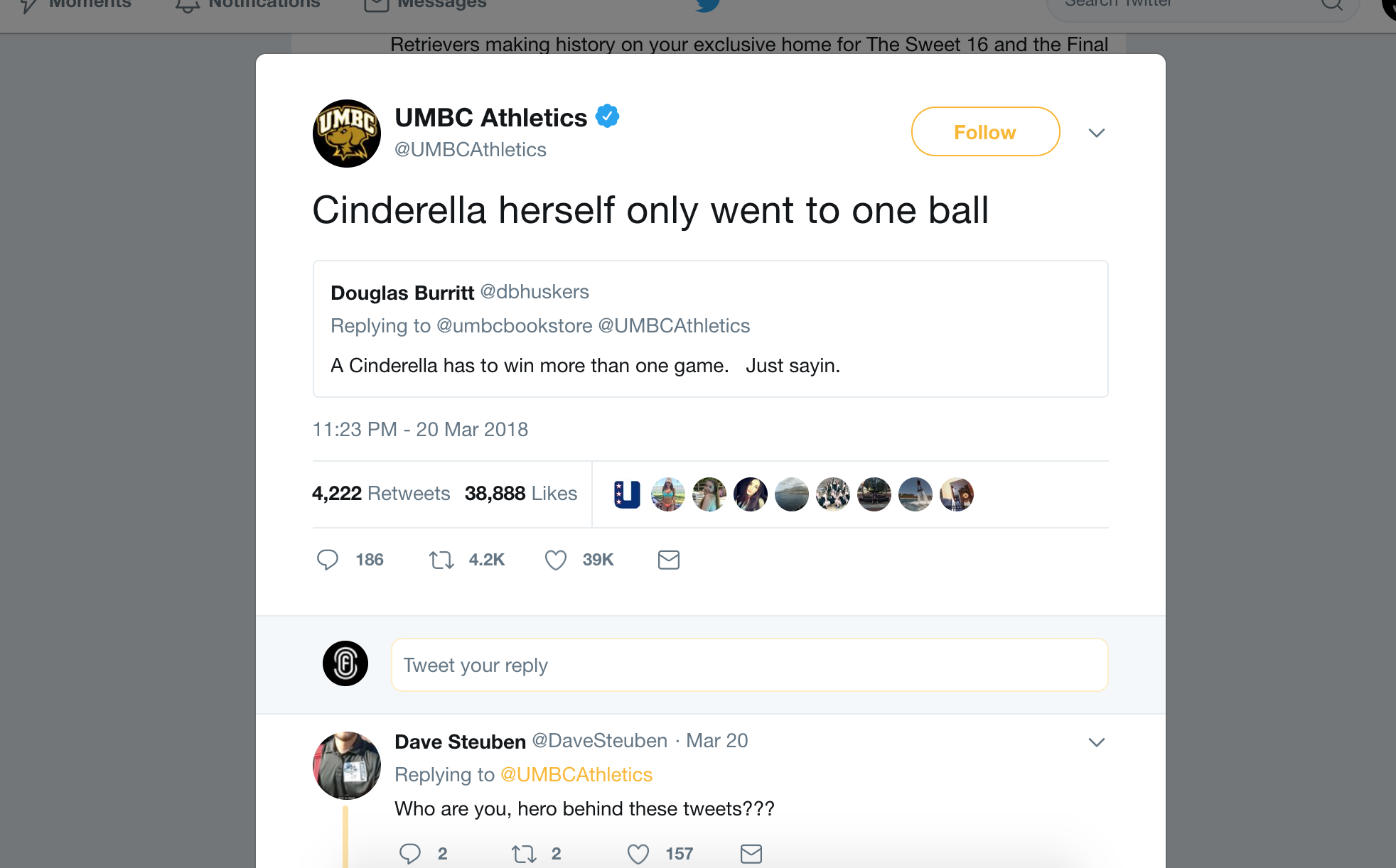 As is well known by now, the № 16 seeded University of Maryland, Baltimore County, defeated the ACC champions and №1 overall seeded Virginia Cavaliers during the first round of the 2018 NCAA Men’s Basketball Tournament. The win was the biggest upset in tournament history and the university’s athletics Twitter account dedicated itself to an entertaining and captivating strategy that fed off the historic moment.