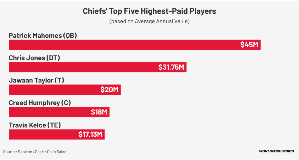 Beyond the 2013 arrival of Reid, now the highest-paid coach in U.S. sports, a key element in the Chiefs’ ongoing success is the continued reworking of Mahomes’s contract once he established himself as a superstar. The quarterback signed in 2020 a 10-year extension worth up to $503 million, then the largest player contract in U.S. sports history.