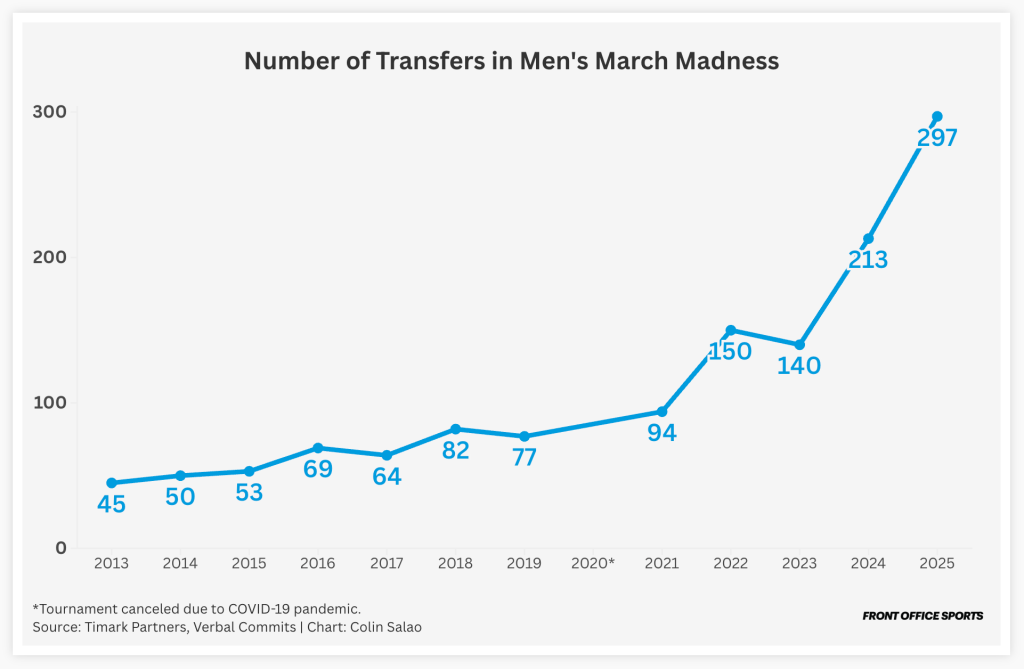The current state of the portal is already reflected in the 297 transferred players competing in March Madness (according to a study by AD Advisors and Timark Partners). This is a subset of the more than 2,000 players in the portal last year—amounting to about half of all college basketball players.