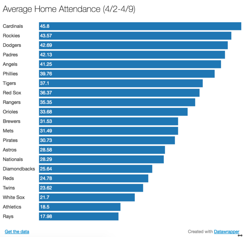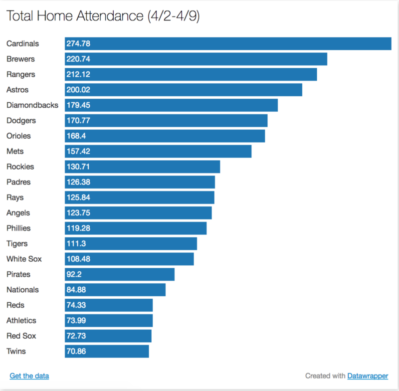 After the first week of the 2017 MLB season (4/2–4/9), the Cardinals find themselves atop the attendance chart pulling in a whopping 274,776 fans according to data provided by Sportradar. They took in around 45,800 people per game, which is nearly 2,000 more than Busch Stadium’s capacity.