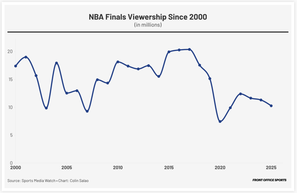 The full seven-game series averaged 10.27 million viewers, down 9.3% compared to last year’s Finals between the Mavericks and Celtics (11.31 million). That makes it the least-watched NBA Finals series since 2021 (9.91 million, Bucks vs. Suns and the least-watched since 2007 when excluding COVID-19-impacted series (9.29 million, Spurs vs. Cavaliers).