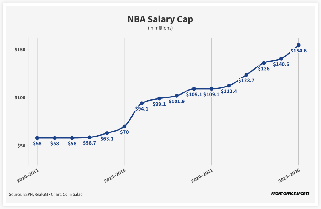 The NBA will raise the salary cap by 10% for the 2025–2026 season, bringing the cap number from $140.6 million to $154.6 million, according to ESPN. The bump is the largest possible percent increase allowed by the collective bargaining agreement.