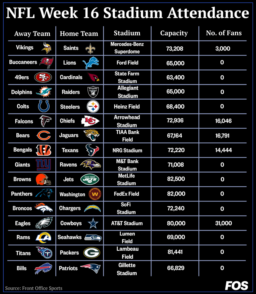 NFL Team 2020 Fan Attendance Tracker (Last Updated: 2:45 p.m. ET on Nov. 25):