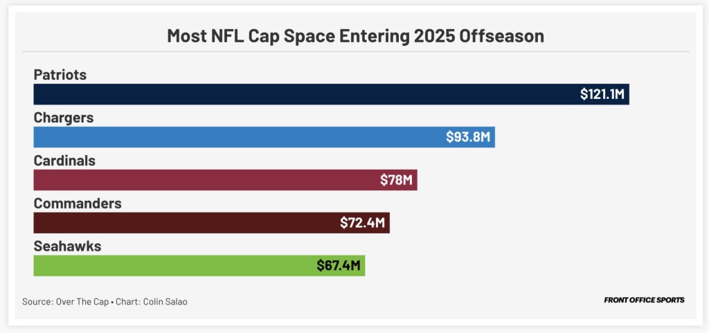 The franchise’s roster construction made sense given their situation. They entered the 2025 offseason with $121.1 million in cap space, the most in the NFL and about 29% more than any other team, according to Over The Cap.