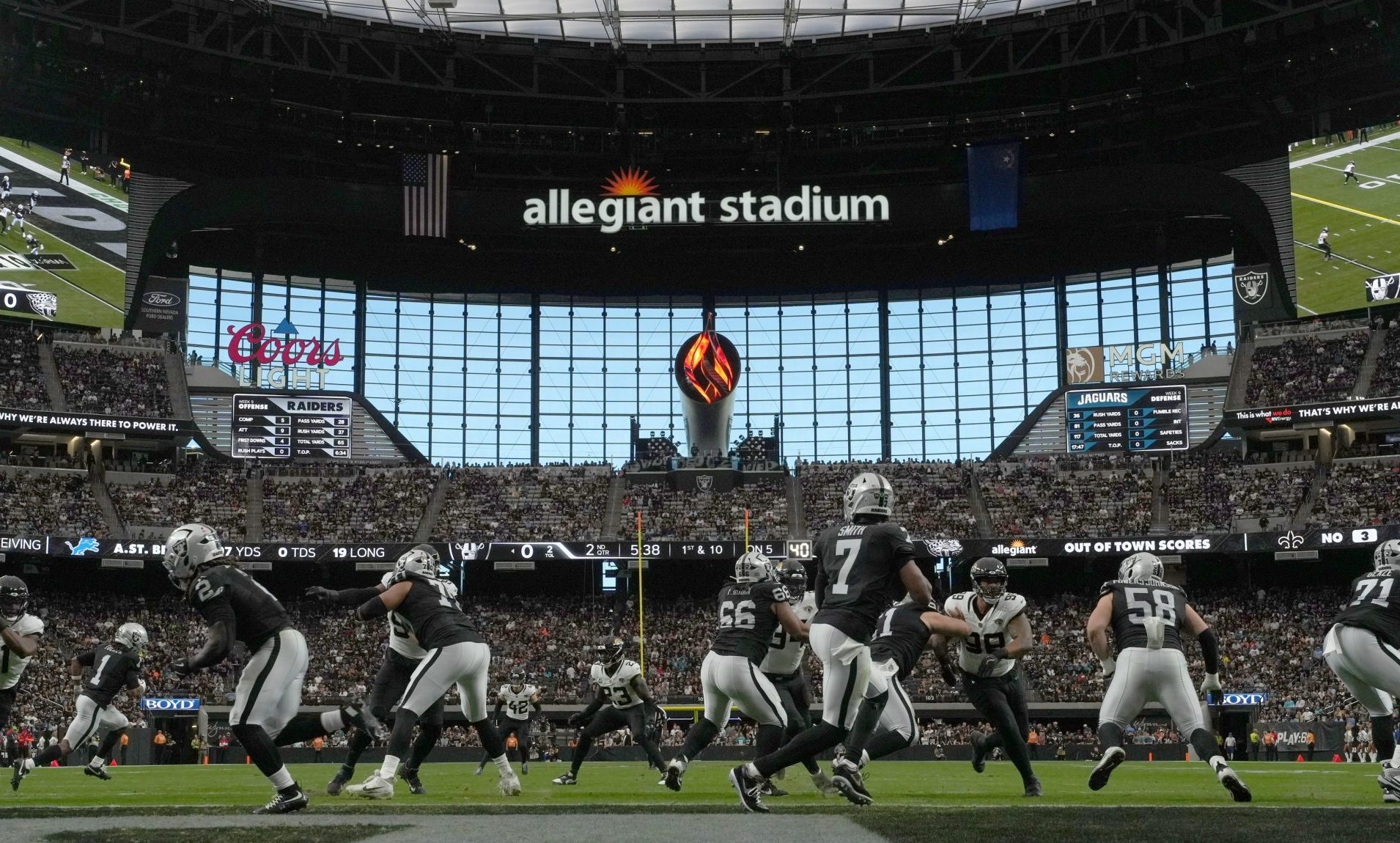 Dec 22, 2024; Paradise, Nevada, USA; NFL line judge Robin DeLorenzo (134) gestures during the game between the Jacksonville Jaguars and the Las Vegas Raiders Allegiant Stadium. Mandatory Credit: Kirby Lee-Imagn Images