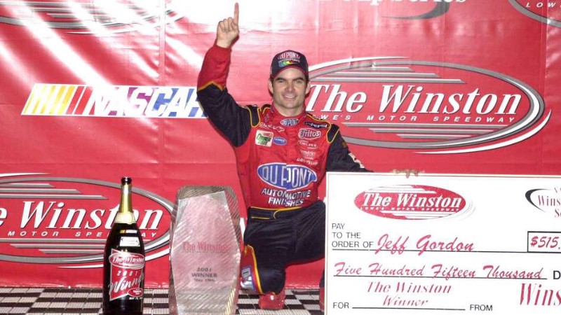Jeff Gordon won the 2001 All-Star race in a backup car. After several drivers, including Gordon, wrecked on lap one (due to rain), NASCAR allowed drivers to utilize their backup cars. It paid off for Gordon who found himself in victory lane. Image from Fox Sports.
