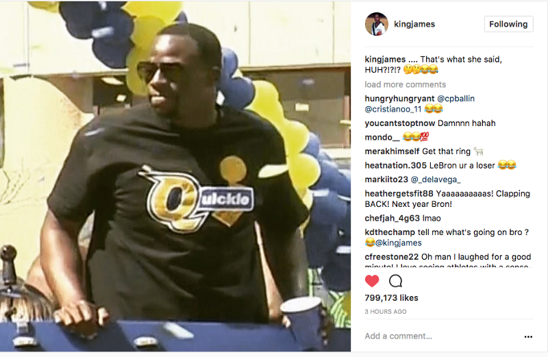 On Thursday, June 15th, the Warriors had their celebratory parade, in which Draymond Green wore a shirt that read “Quickie”, with the logo of the Cavalier’s Quicken Loans Arena on it.