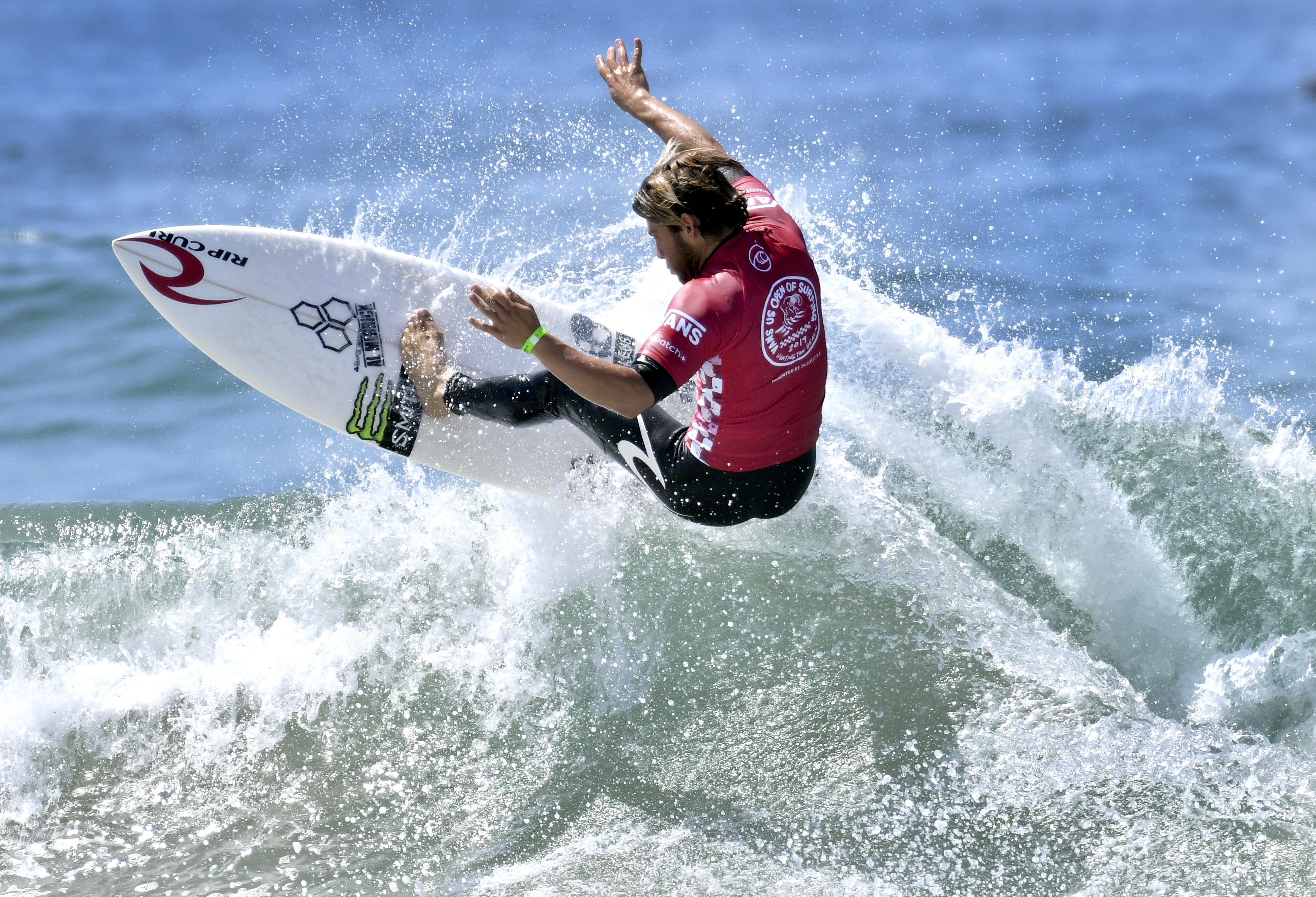 Aug 2, 2019; Huntington Beach, CA, USA; Conner Coffin of the USA competes during the Round 4 of the Vans US Open of Surfing competition at Surf Stadium. Mandatory Credit: Robert Hanashiro-USA TODAY Sports
